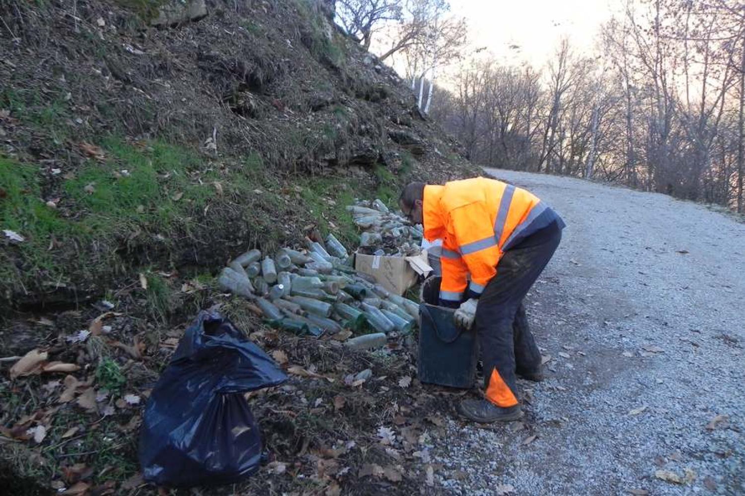 Après une opération de débroussaillage pour enlever un maximum de végétation et de ronces, l'équipe des contrats verts de l'ASA-DFCI en charge de l'entretien de l'espace rural a procédé au brûlage des déchets verts puis à la collecte à la main de l'ensemble des déchets.