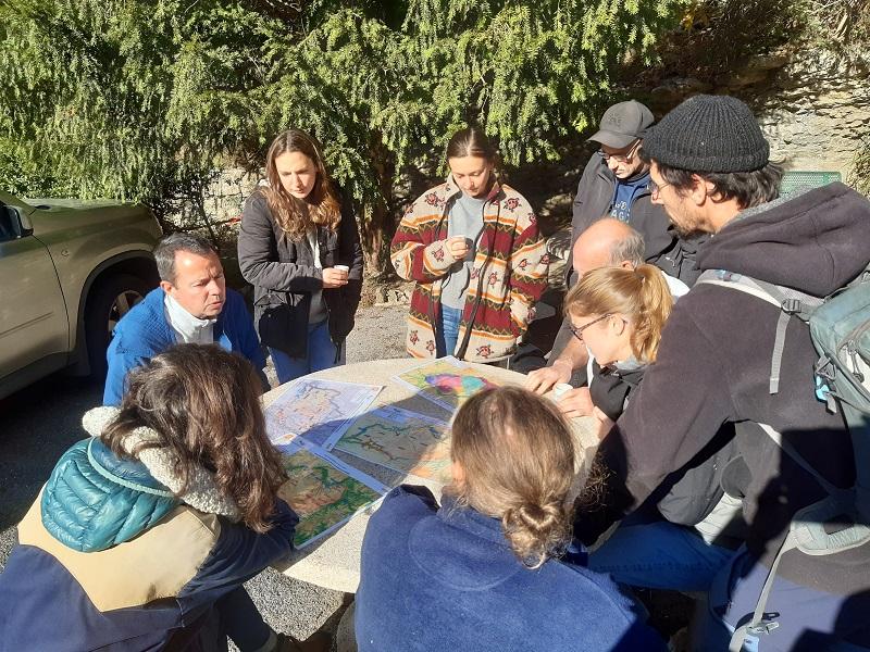 Après la matinée passée en salle sur les sujets de la marque et un repas partagé au soleil sur la terrasse, Hervé Picq – technicien agri-environnement du Causse, nous a rejoint pour nous présenter les liens entre la biodiversité caussenarde et l'agropastoralisme : faune, flore et archéologie nous ont été dévoilées autour du Mas-Saint-Chély.