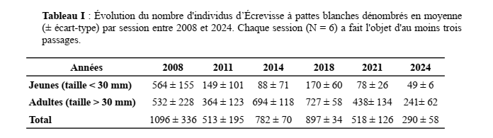 Le tableau ci-dessous illustre l’évolution des populations d’écrevisses à pattes blanches depuis 2008 :